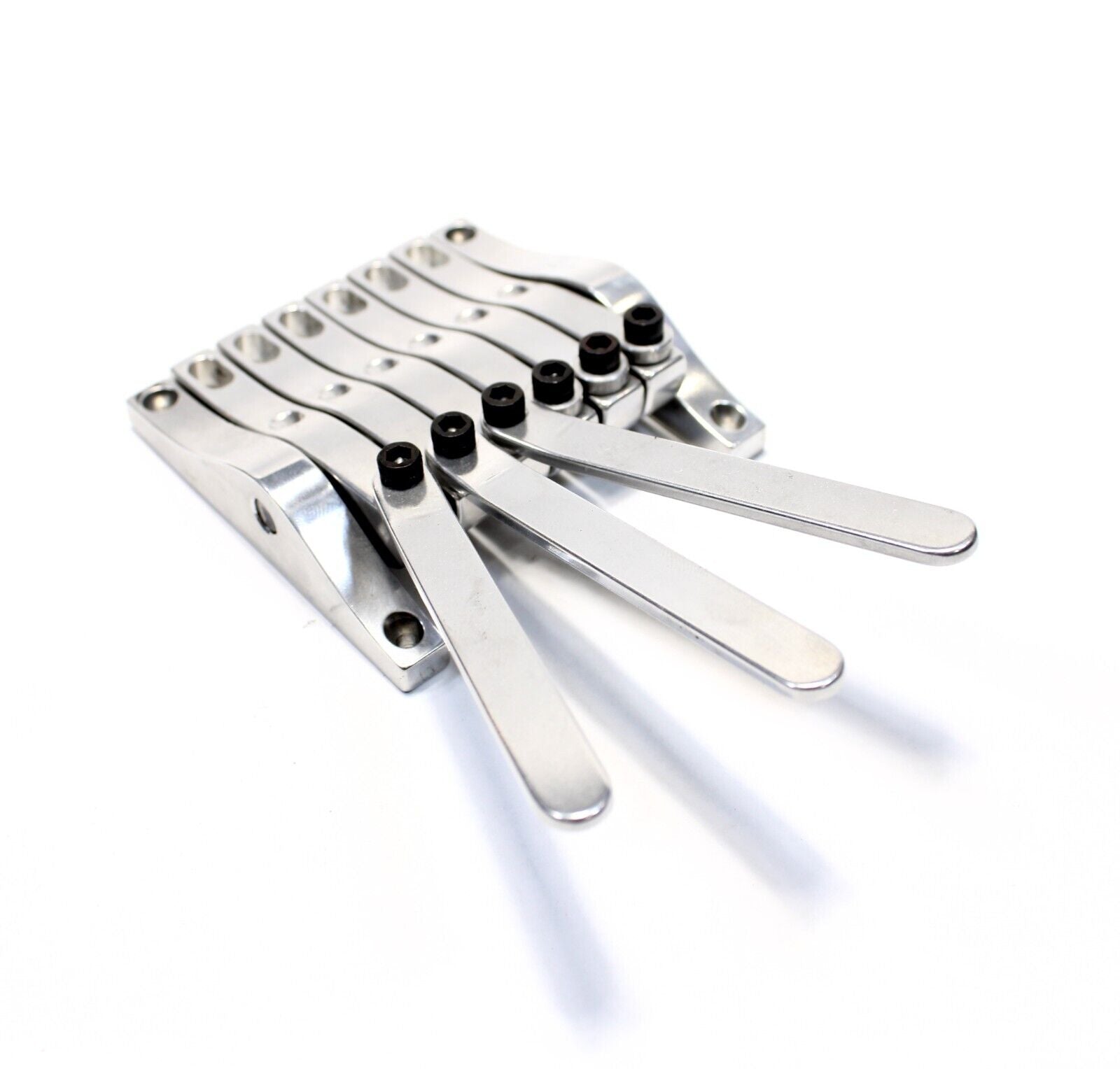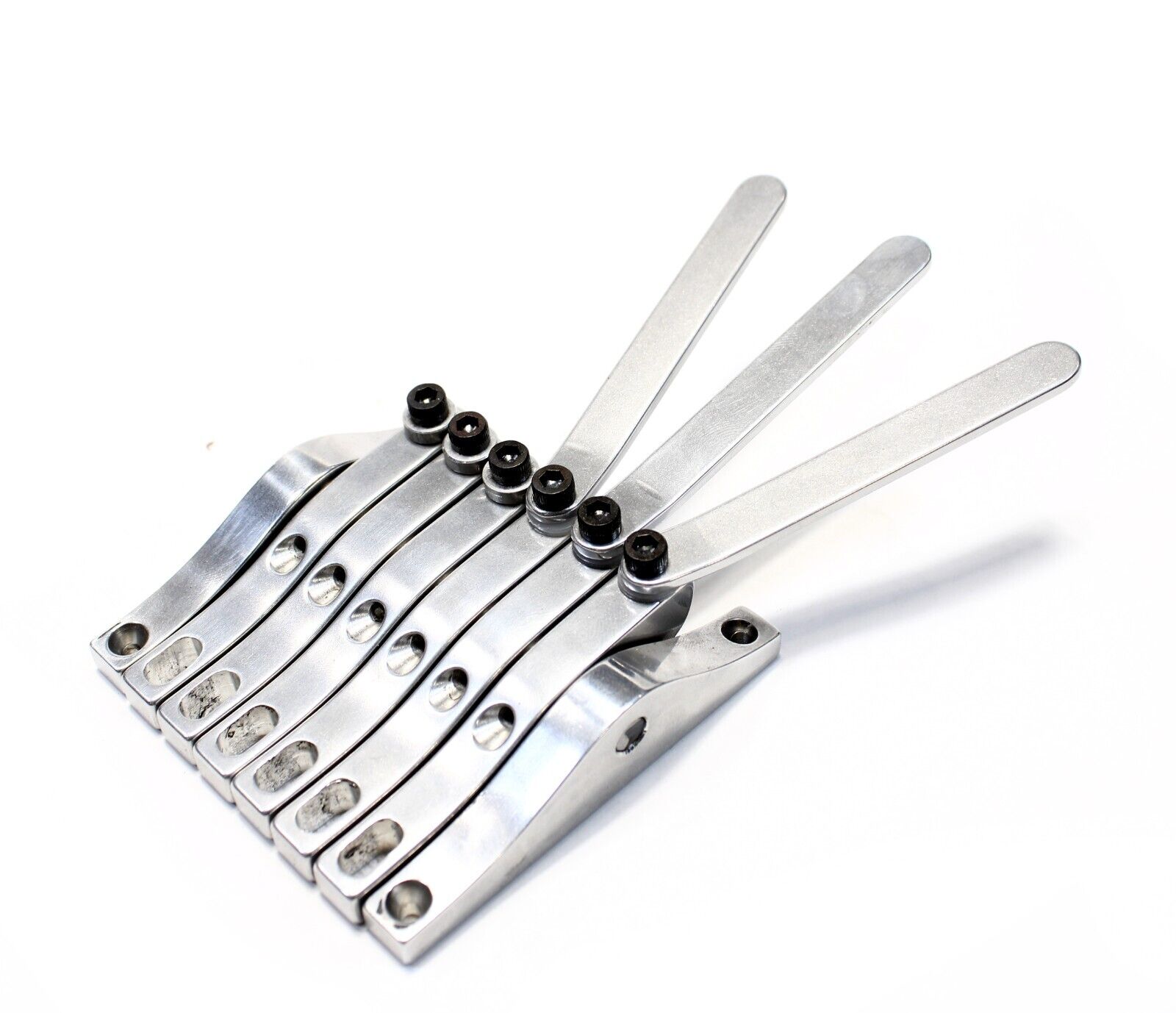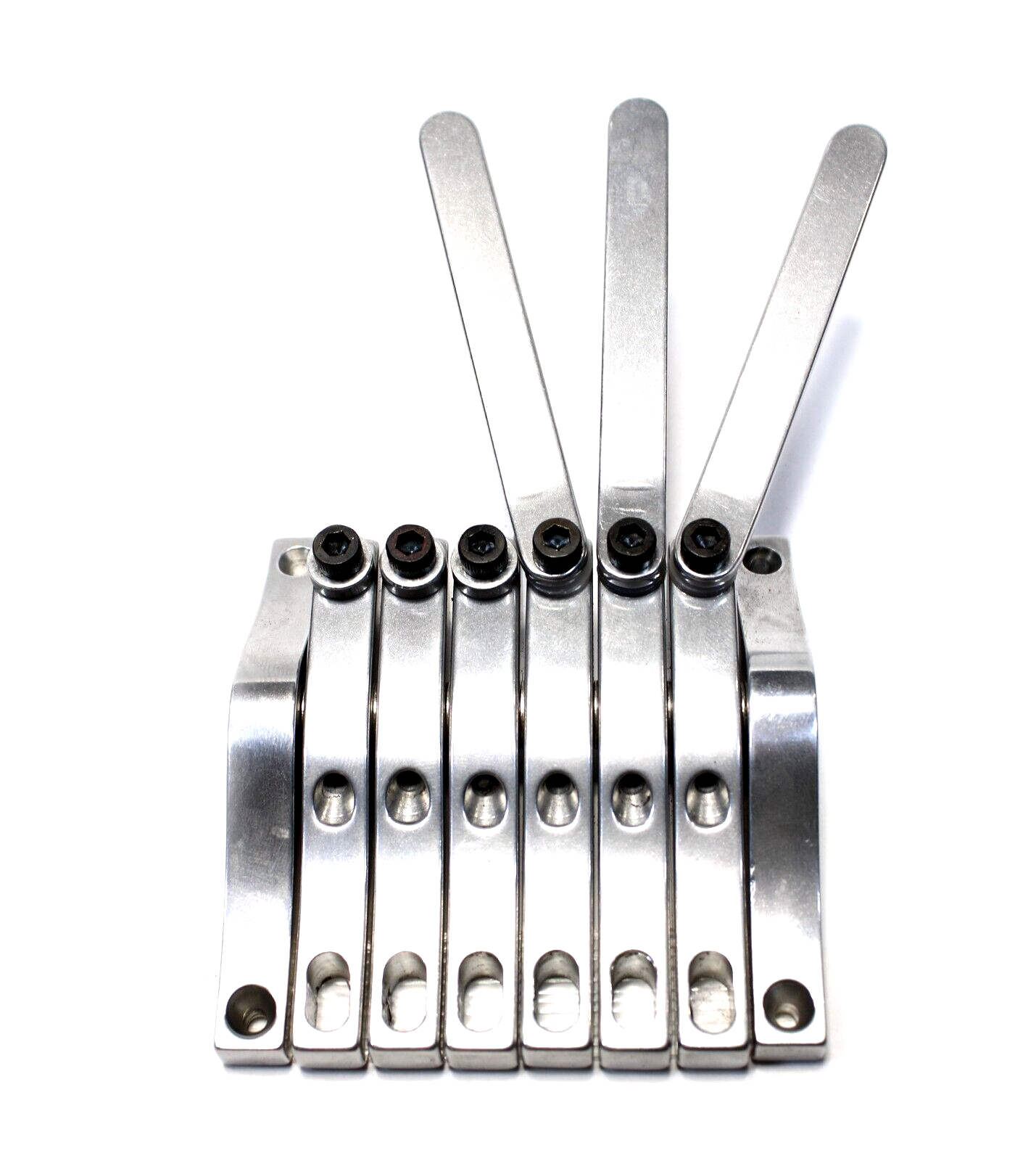The same basic functionality as the original Pitch Witch with an extended range that covers 8 strings instead of two. This is intended to fully replace the tailpiece for an 8 string lap steel. All 8 benders are not intended to be used at once, rather levers can be transferred back and fourth between rockers for different tunings and string combinations. These benders use a .4" string spacing to match the bridges that I also make.