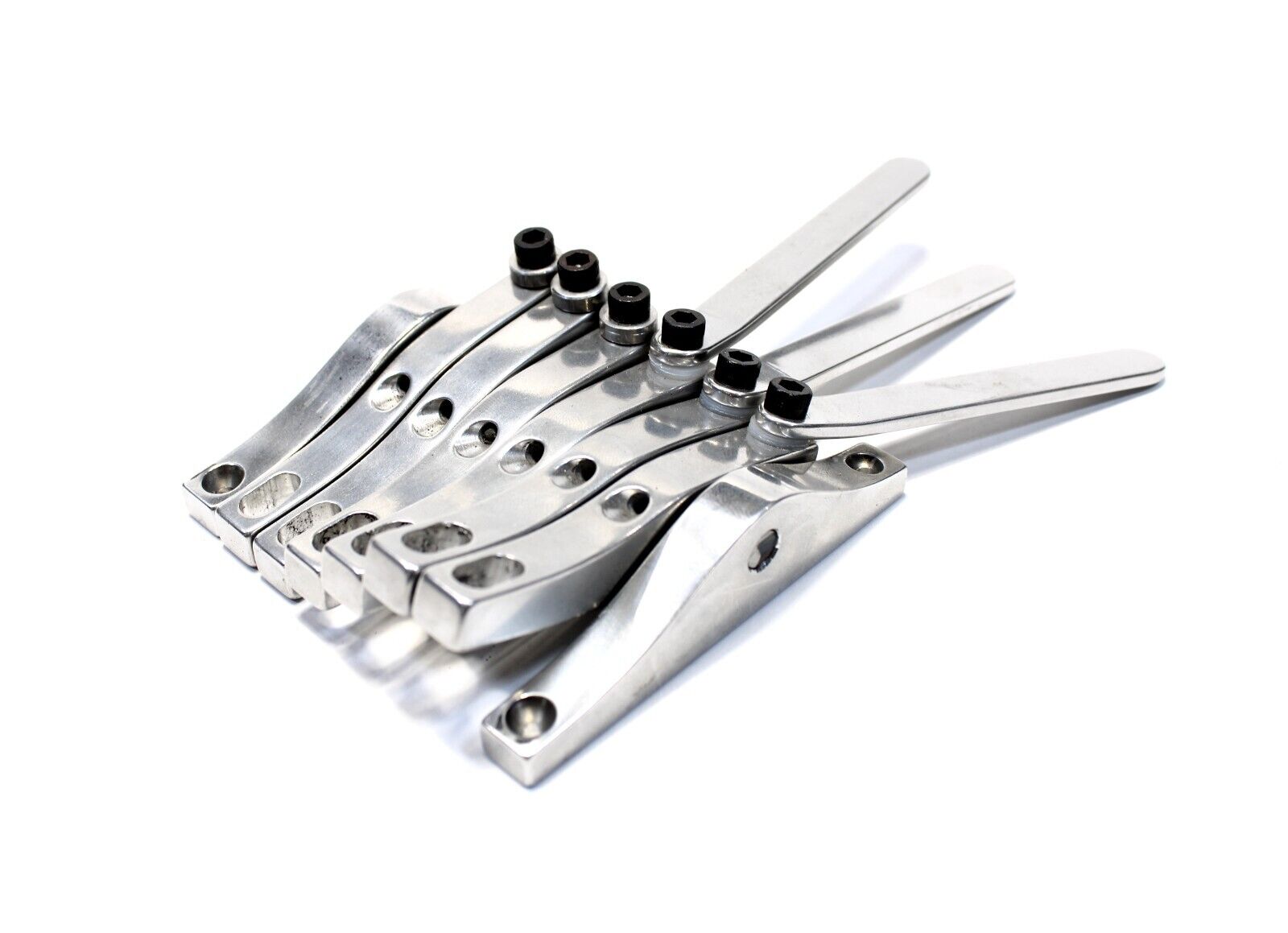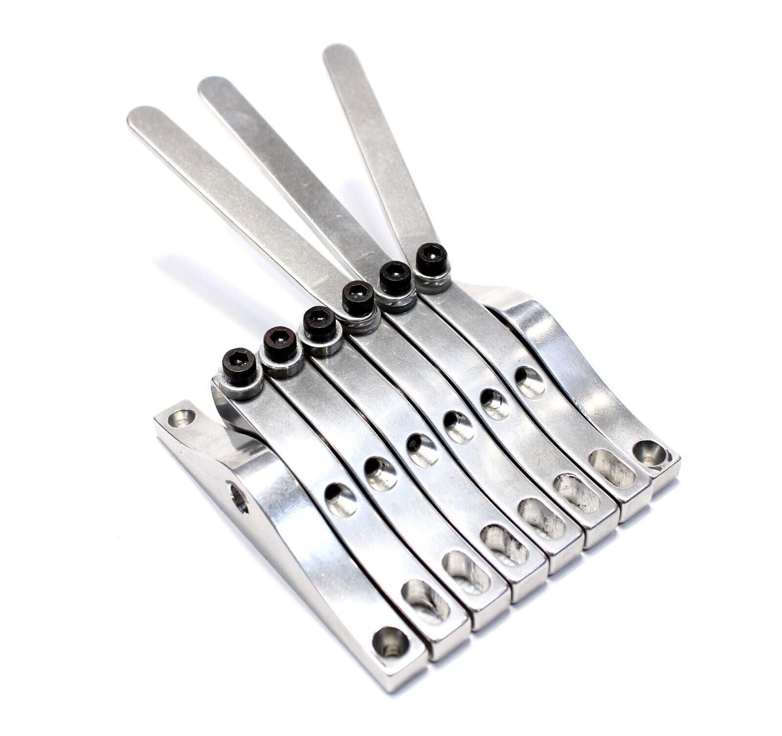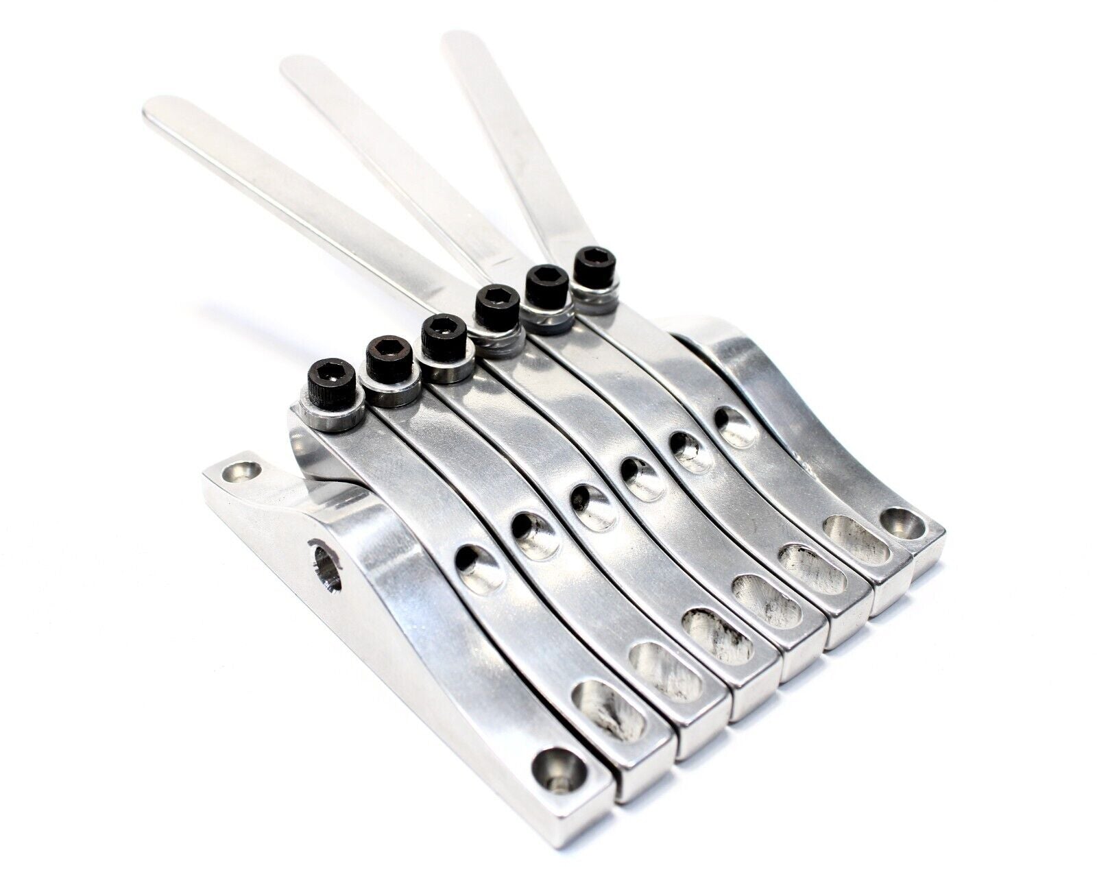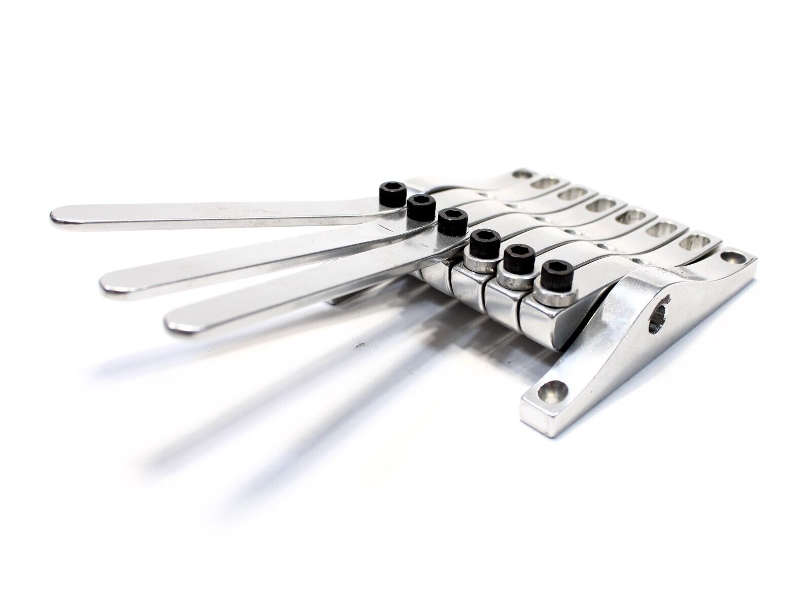 The same basic functionality as the original Pitch Witch with an extended range that covers 8 strings instead of two. This is intended to fully replace the tailpiece for an 8 string lap steel. All 8 benders are not intended to be used at once, rather levers can be transferred back and fourth between rockers for different tunings and string combinations. These benders use a .4" string spacing to match the bridges that I also make.