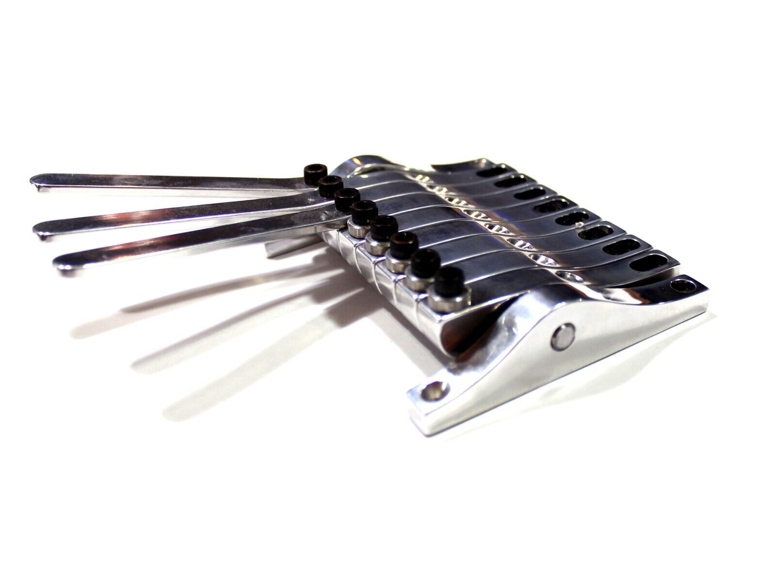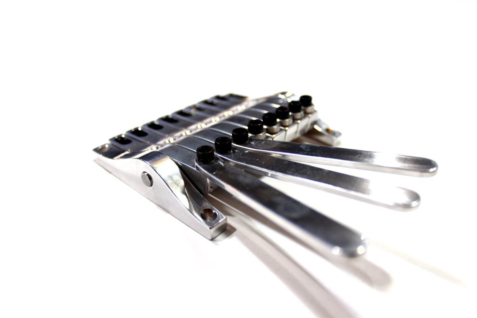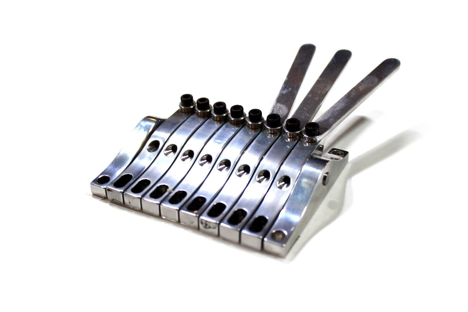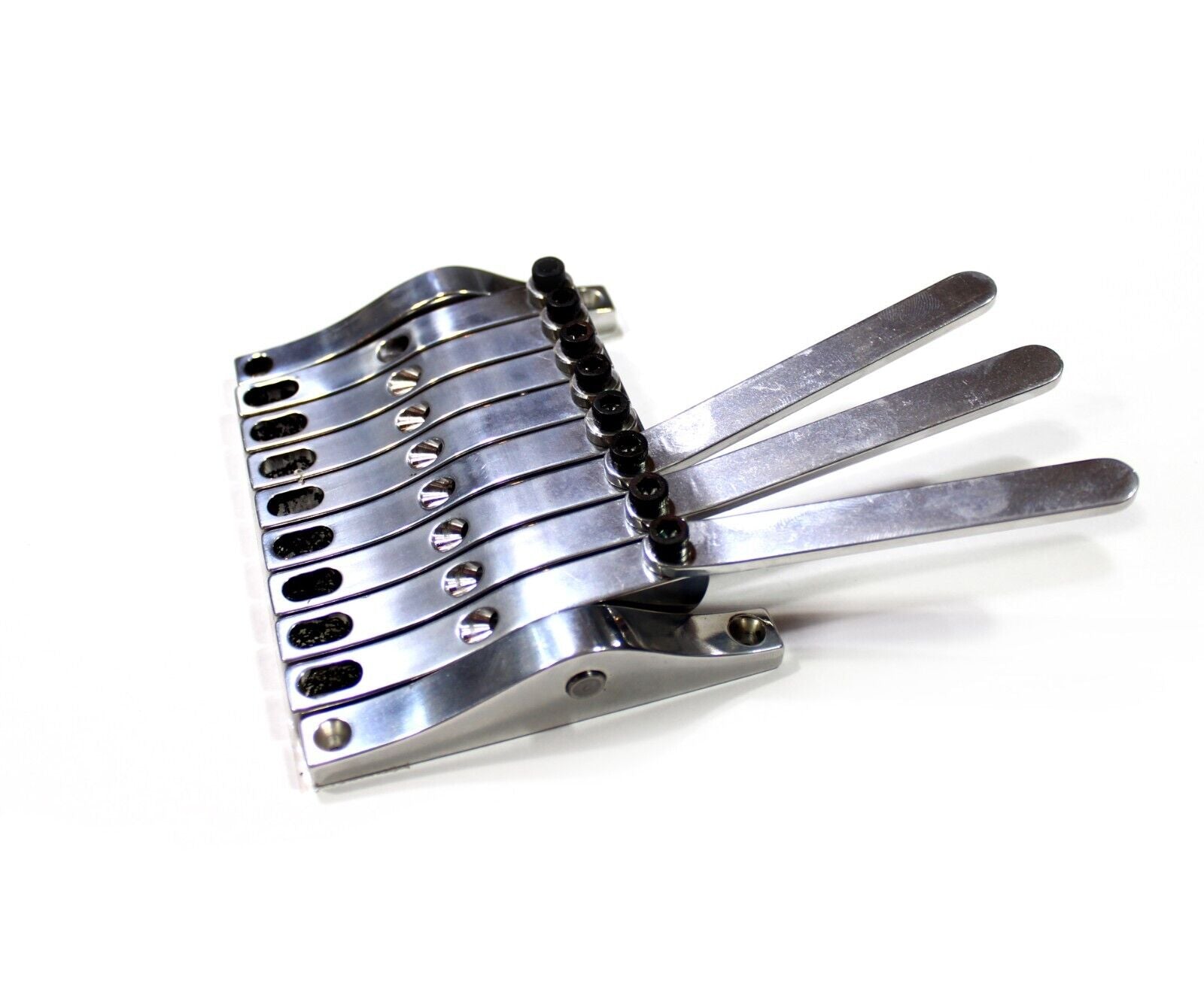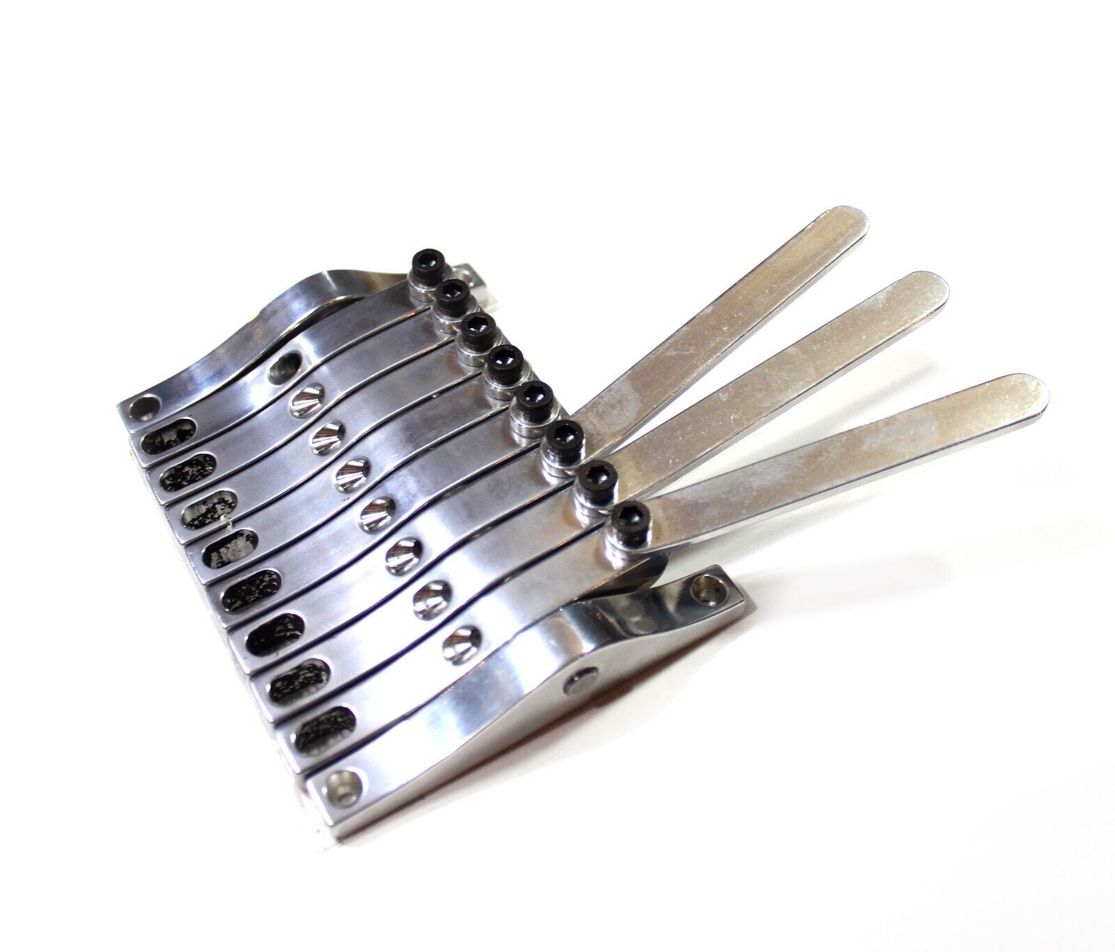 The same basic functionality as the original Pitch Witch with an extended range that covers 8 strings instead of two. This is intended to fully replace the tailpiece for an 8 string lap steel. All 8 benders are not intended to be used at once, rather levers can be transferred back and fourth between rockers for different tunings and string combinations. These benders use a .4" string spacing to match the bridges that I also make.
